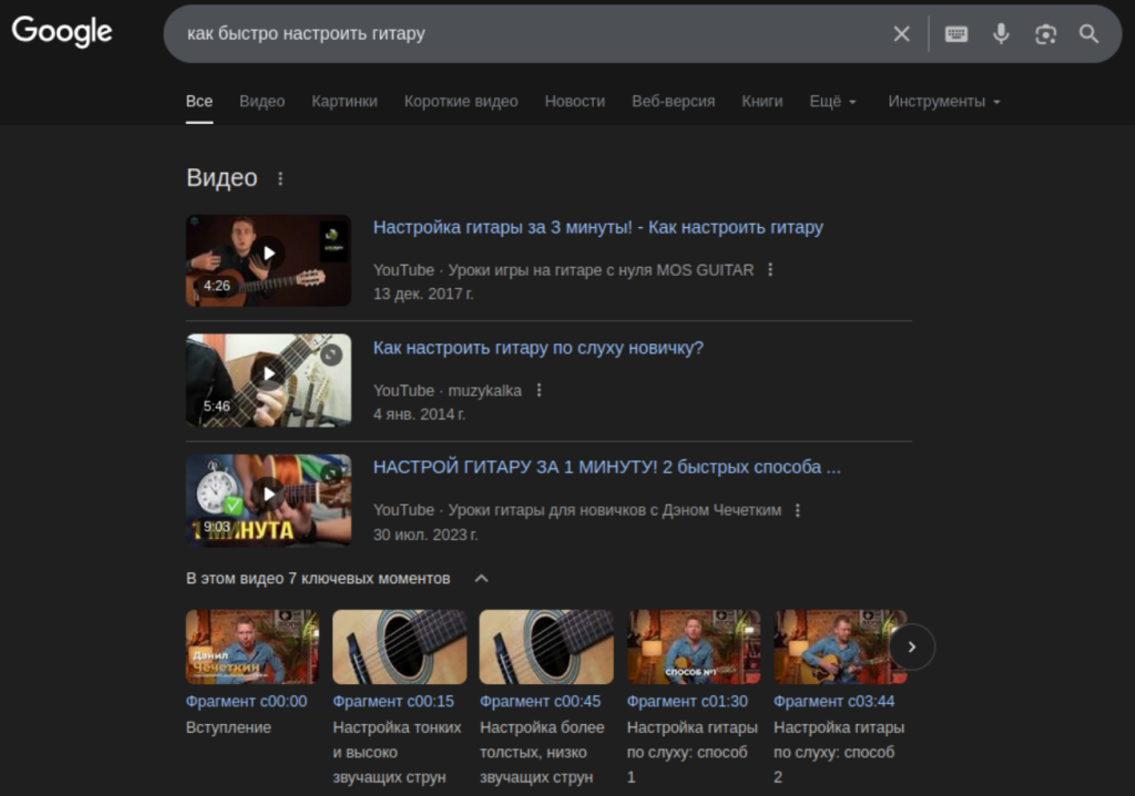 Видео-резюме — ещё один тренд. Алгоритм индексирует видеоролики и вырезает из них короткие фрагменты с ответами на конкретные вопросы. Для этого Google использует тайм-коды и описания в метаданных. Если вы публикуете видео на YouTube или встраиваете его на сайт, имеет смысл сразу размечать ключевые моменты. Это повышает шанс, что ваш ролик попадёт в выдачу не просто ссылкой, а интерактивным блоком с навигацией — как третье видео на скриншоте: