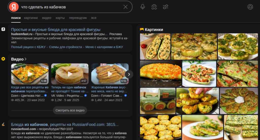 В выдаче «Яндекса», большую часть экрана занимают изображения и видео: